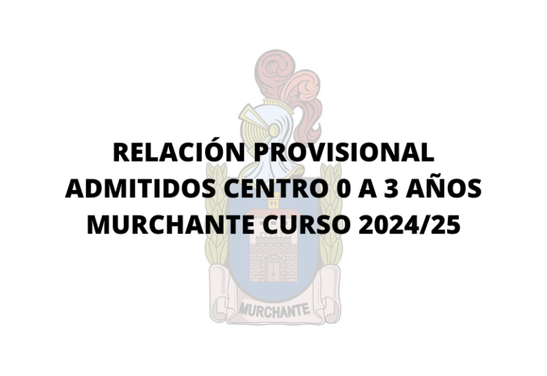 General RELACIÓN PROVISIONAL ADMITIDOS CENTRO 0 A 3 AÑOS MURCHANTE CURSO 2024/25 Leer más » 28 mayo, 2024