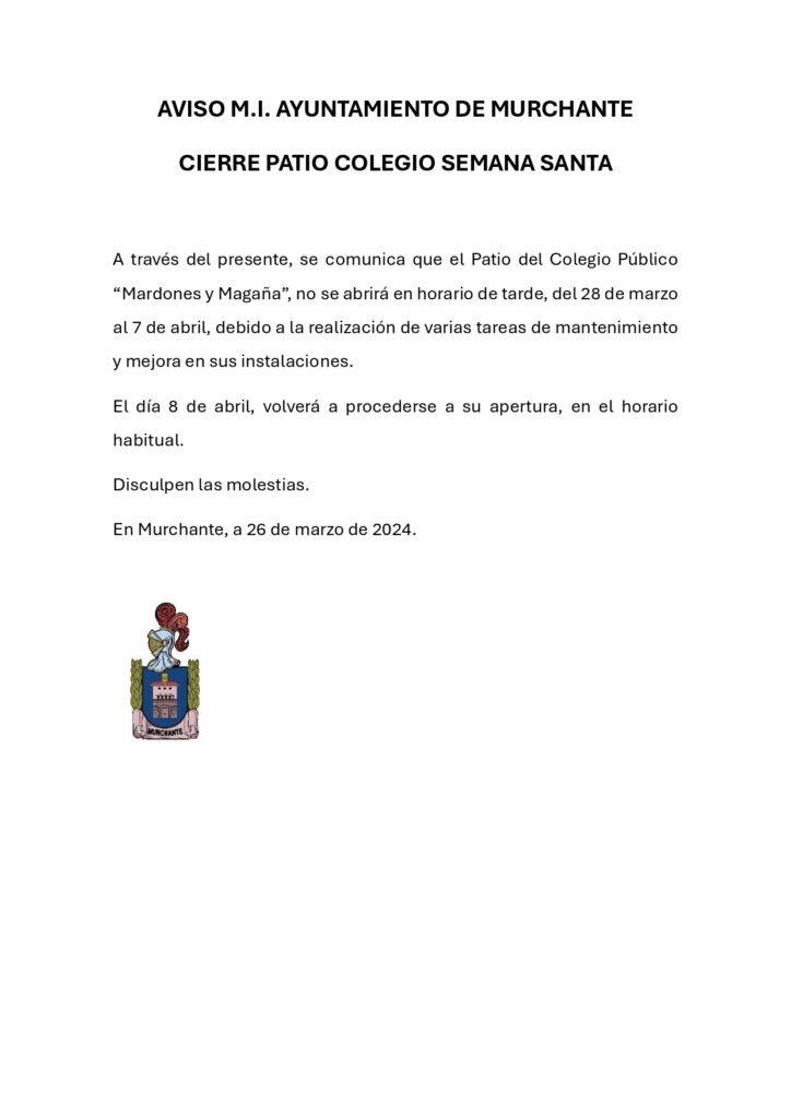 AVISO AYUNTAMIENTO DE MURCHANTE: CIERRE PATIO COLEGIO SEMANA SANTA