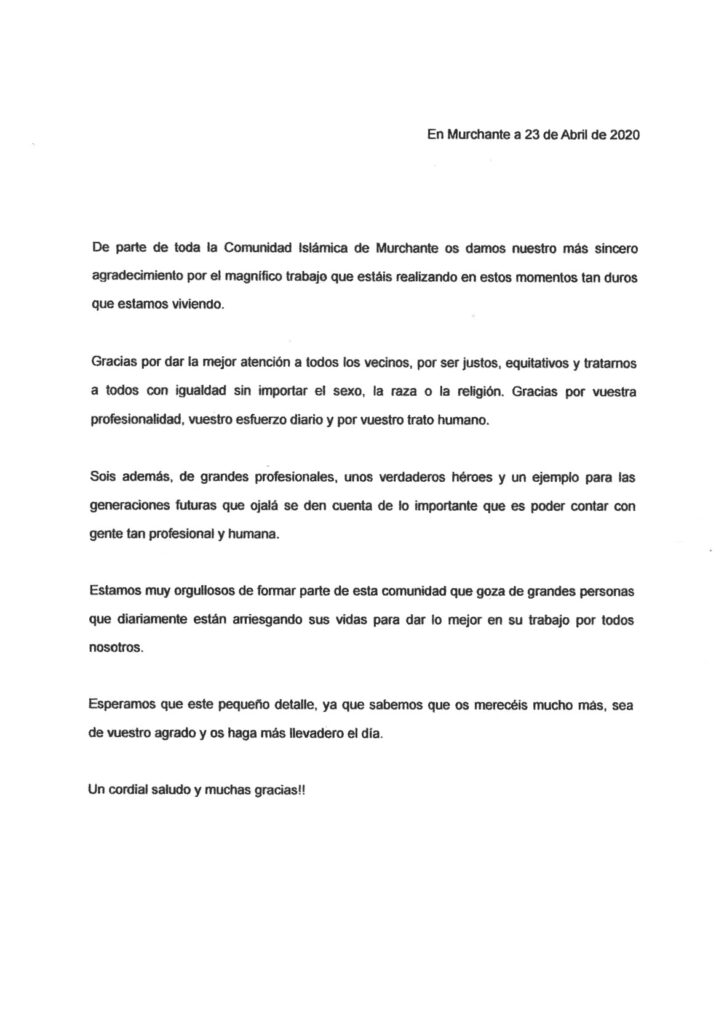 Se adjunta comunicado de agradecimiento de la Comunidad Islámica de Murchante, dirigido a todas aquellas personas, entidades y establecimientos, que están haciendo frente al Coronavirus.