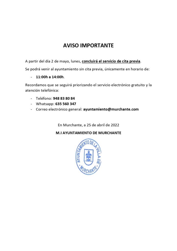 AVISO M.I. AYUNTAMIENTO DE MURCHANTE: NUEVO HORARIO ATENCIÓN AL PÚBLICO