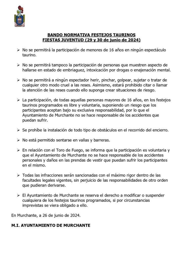 BANDO NORMATIVA FESTEJOS TAURINOS FIESTAS JUVENTUD 2024
