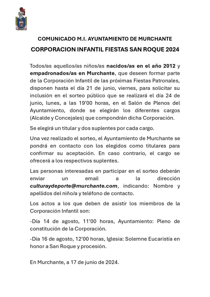 COMUNICADO AYUNTAMIENTO DE MURCHANTE: CORPORACIÓN INFANTIL FIESTAS 2024