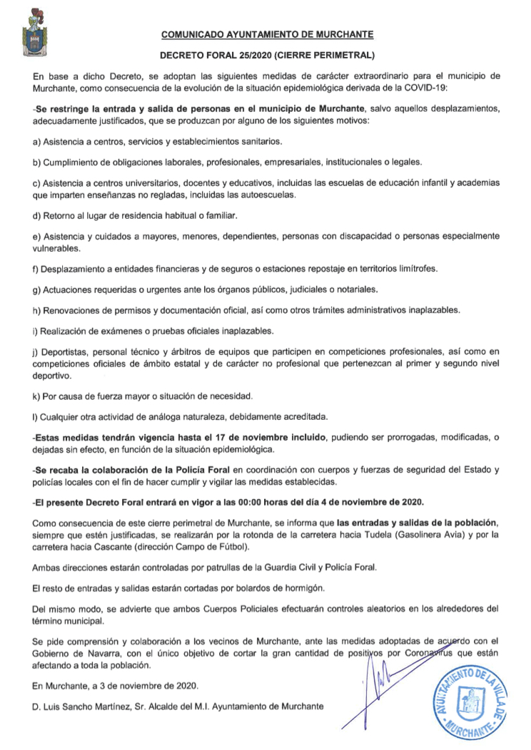 COMUNICADO: MEDIDAS CIERRE PERIMETRAL, DECRETO FORAL 25/2020