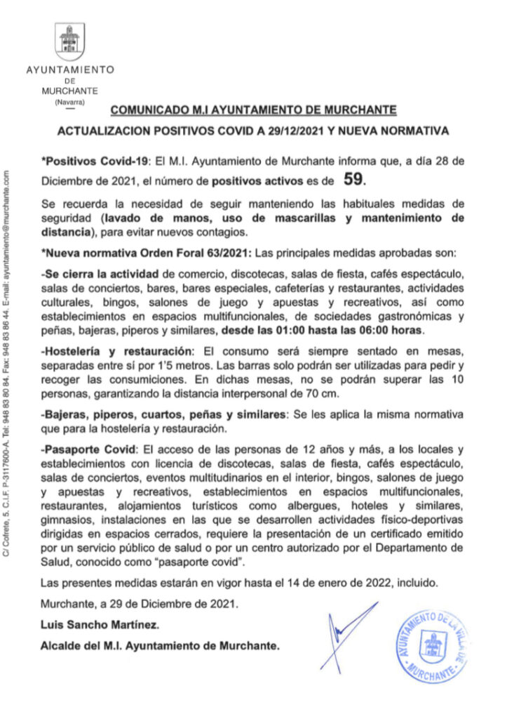 COMUNICADO AYUNTAMIENTO MURCHANTE: POSITIVOS COVID 29/12/2021 Y NUEVA NORMATIVA