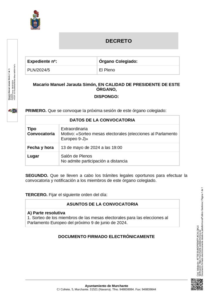 CONVOCATORIA SESIÓN EXTRAORDINARIA PLENO AYUNTAMIENTO DE MURCHANTE