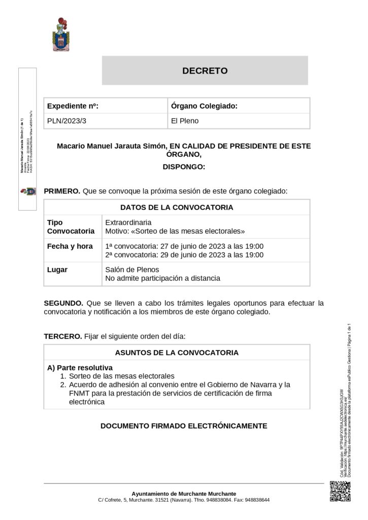 CONVOCATORIA SESIÓN EXTRAORDINARIA PLENO AYUNTAMIENTO DE MURCHANTE