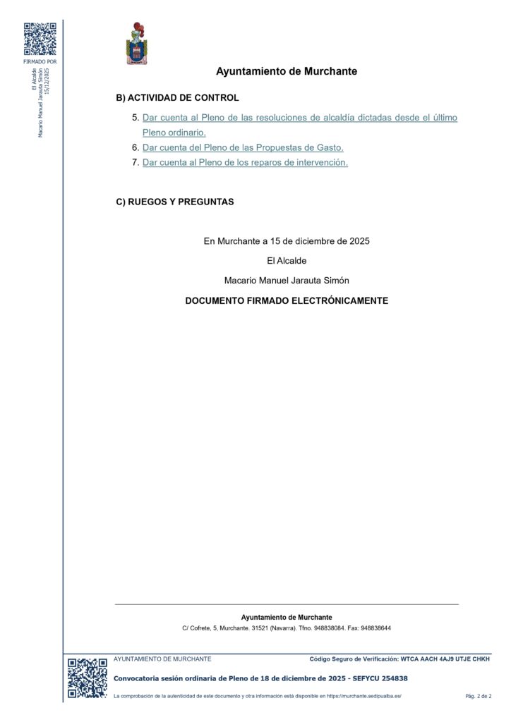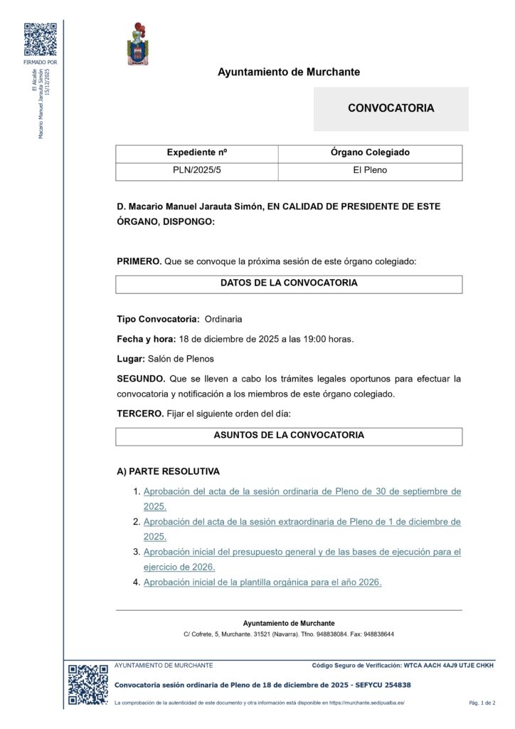 CONVOCATORIA SESIÓN ORDINARIA PLENO AYUNTAMIENTO DE MURCHANTE