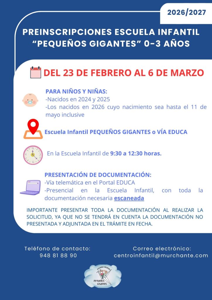 DOCUMENTACIÓN PREINSCRIPCIONES CURSO 2026/27 CENTRO 0 A 3 AÑOS