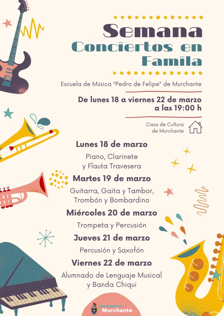 La Semana de Conciertos en familia, de la Escuela de Música «Pedro de Felipe» de Murchante se celebrará del lunes 18 al viernes 22 de marzo, todos los días a las 19:00 horas en la Casa de Cultura de Murchante.