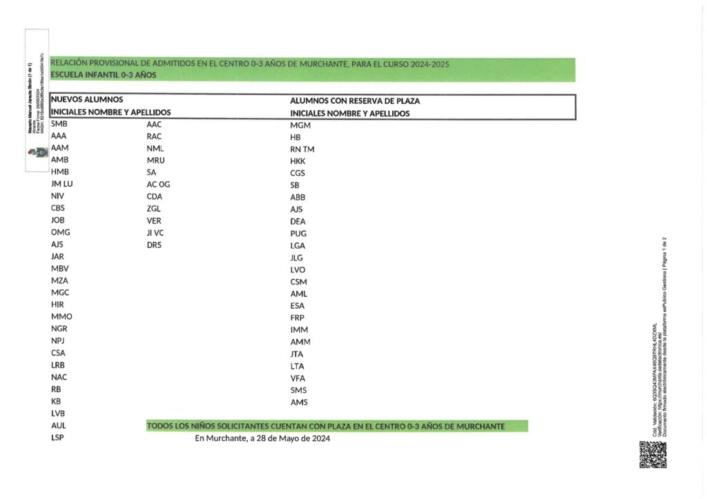 RELACIÓN PROVISIONAL ADMITIDOS CENTRO 0 A 3 AÑOS MURCHANTE CURSO 2024/25